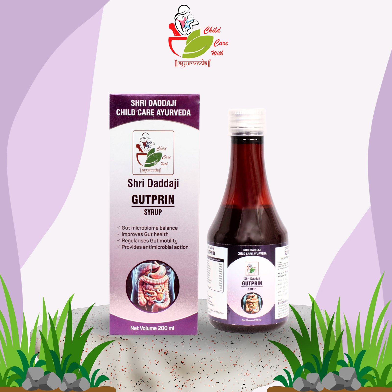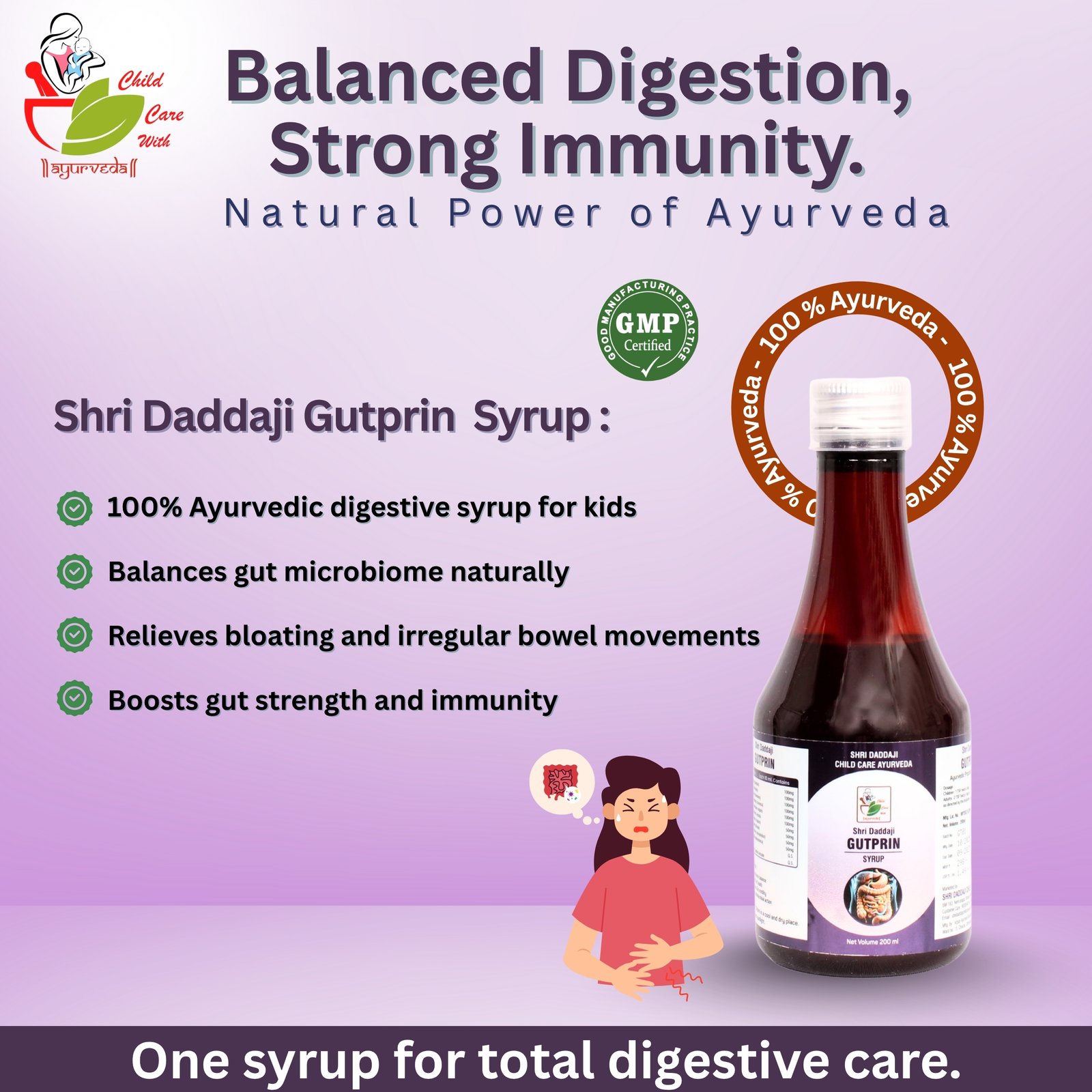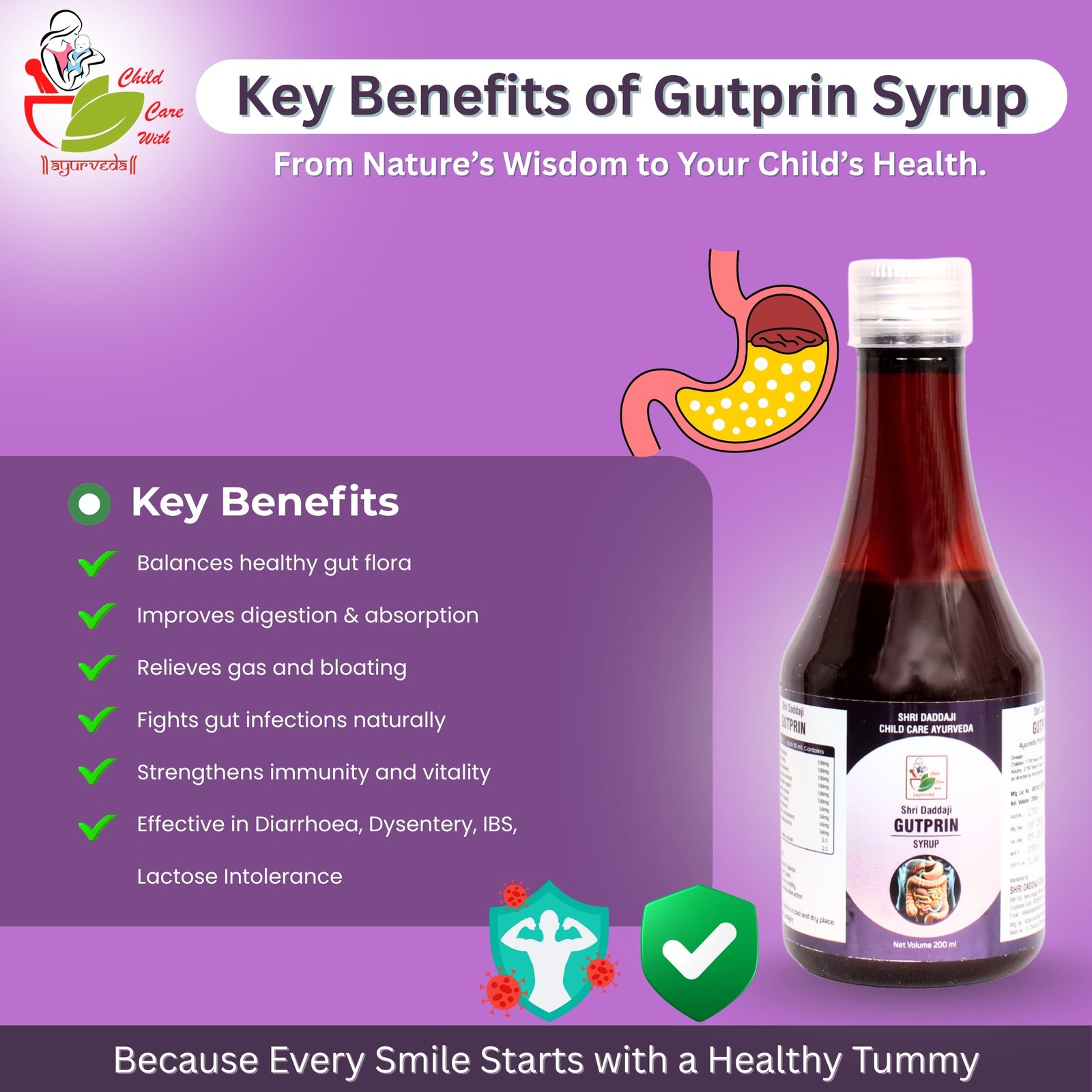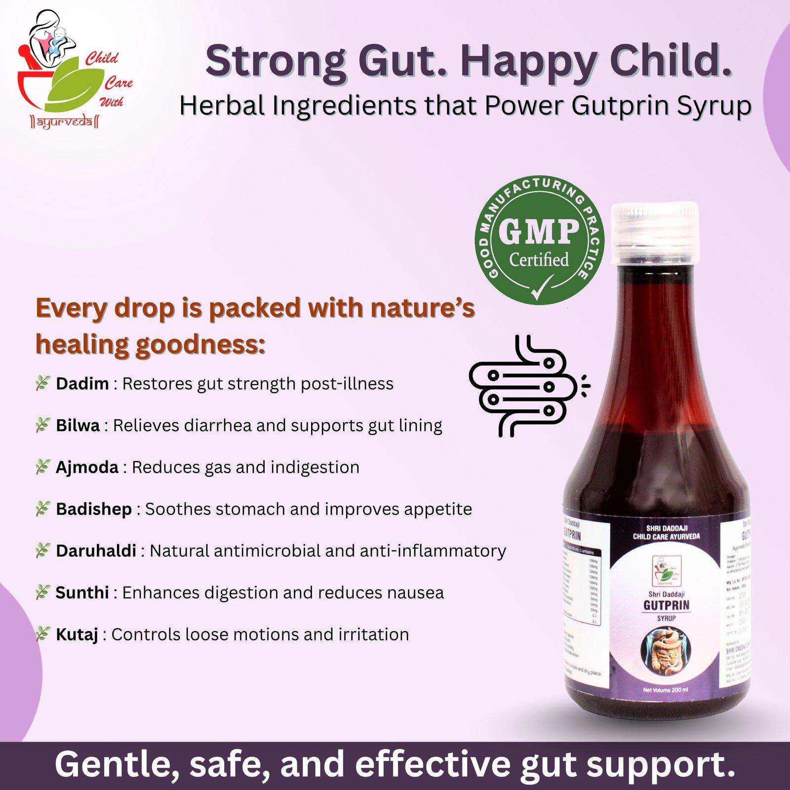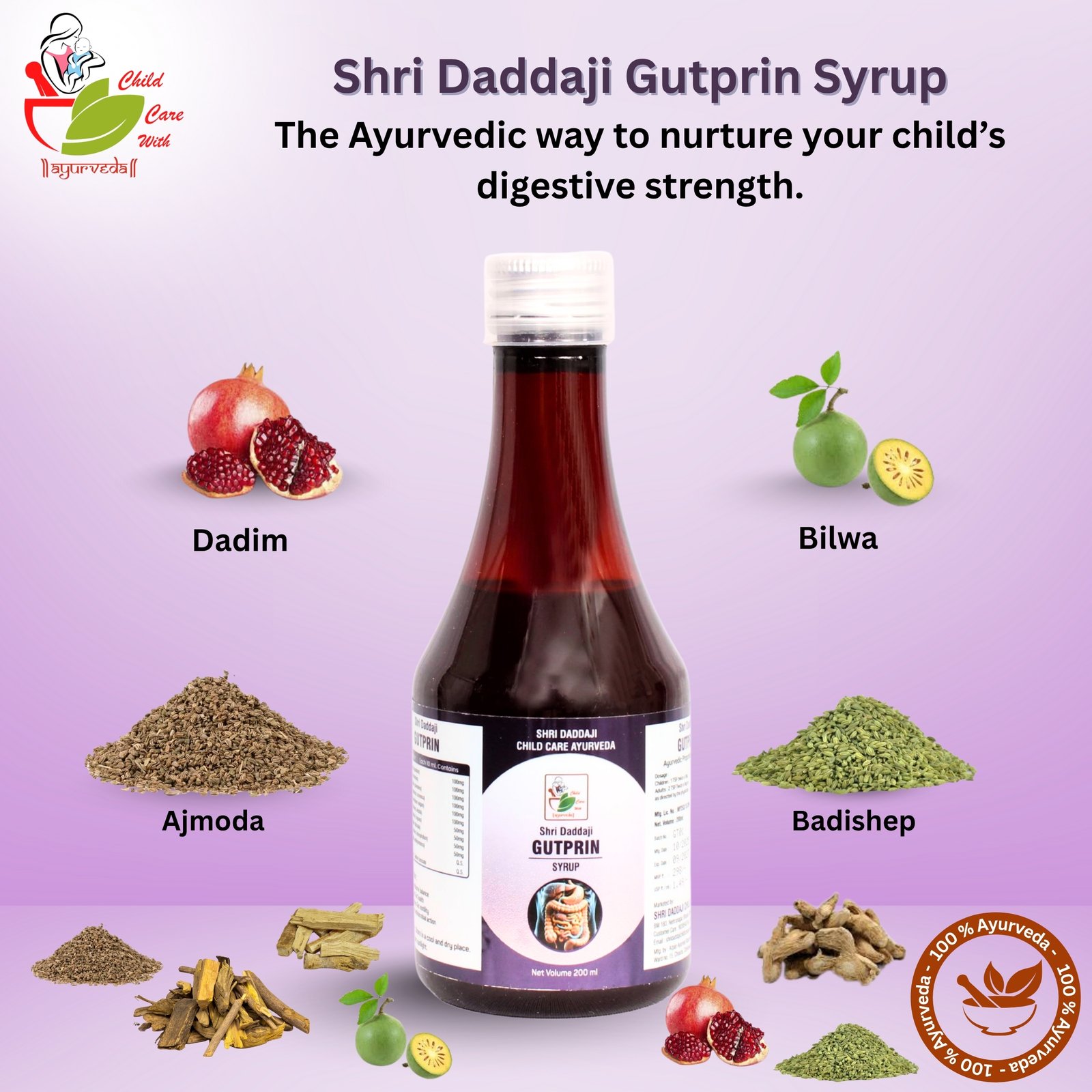 Shri Daddaji Gutprin Ayurvedic Digestive Syrup for Kids, Natural Herbal Formula with Dadim, Bilwa, Ajmoda, Badishep, 200ml
