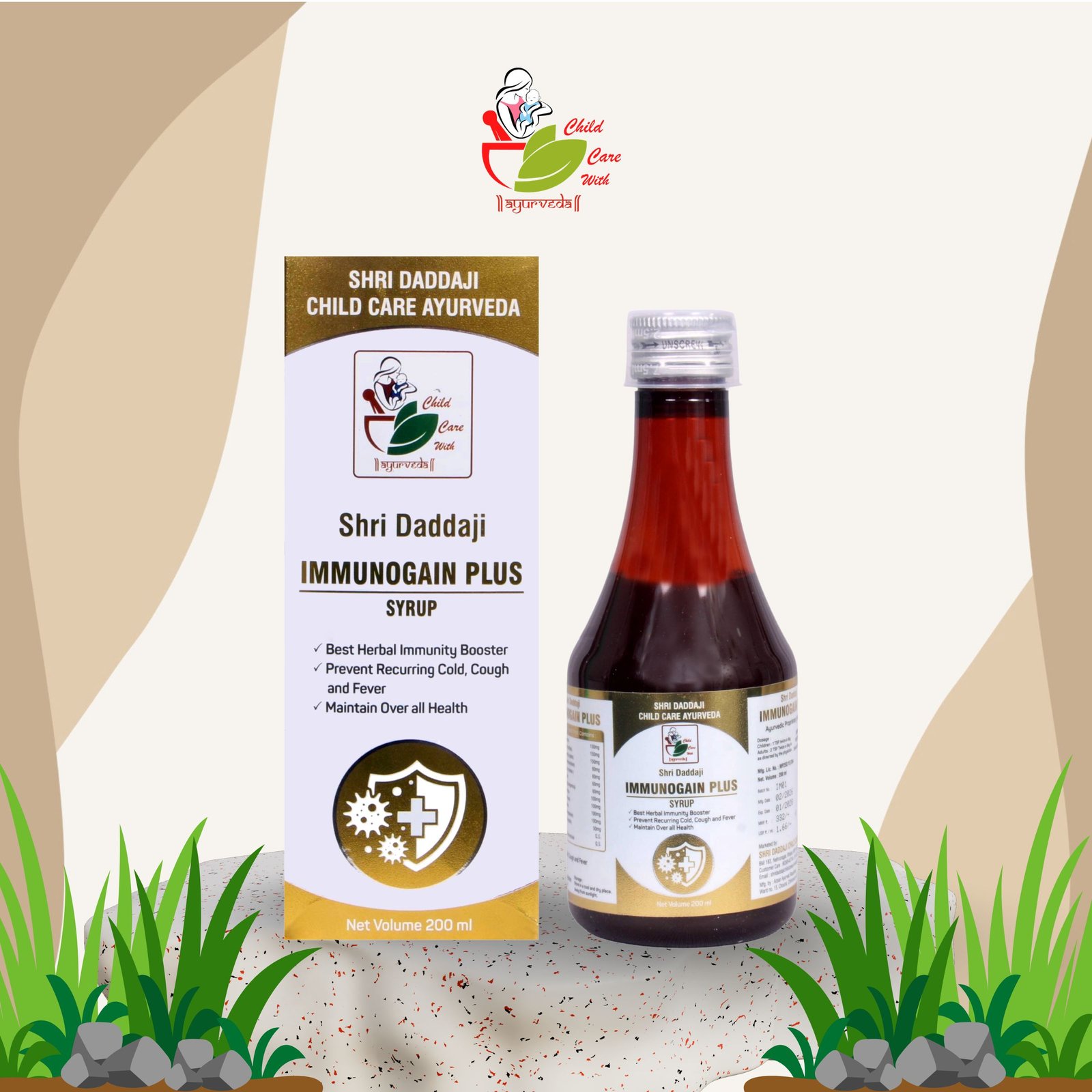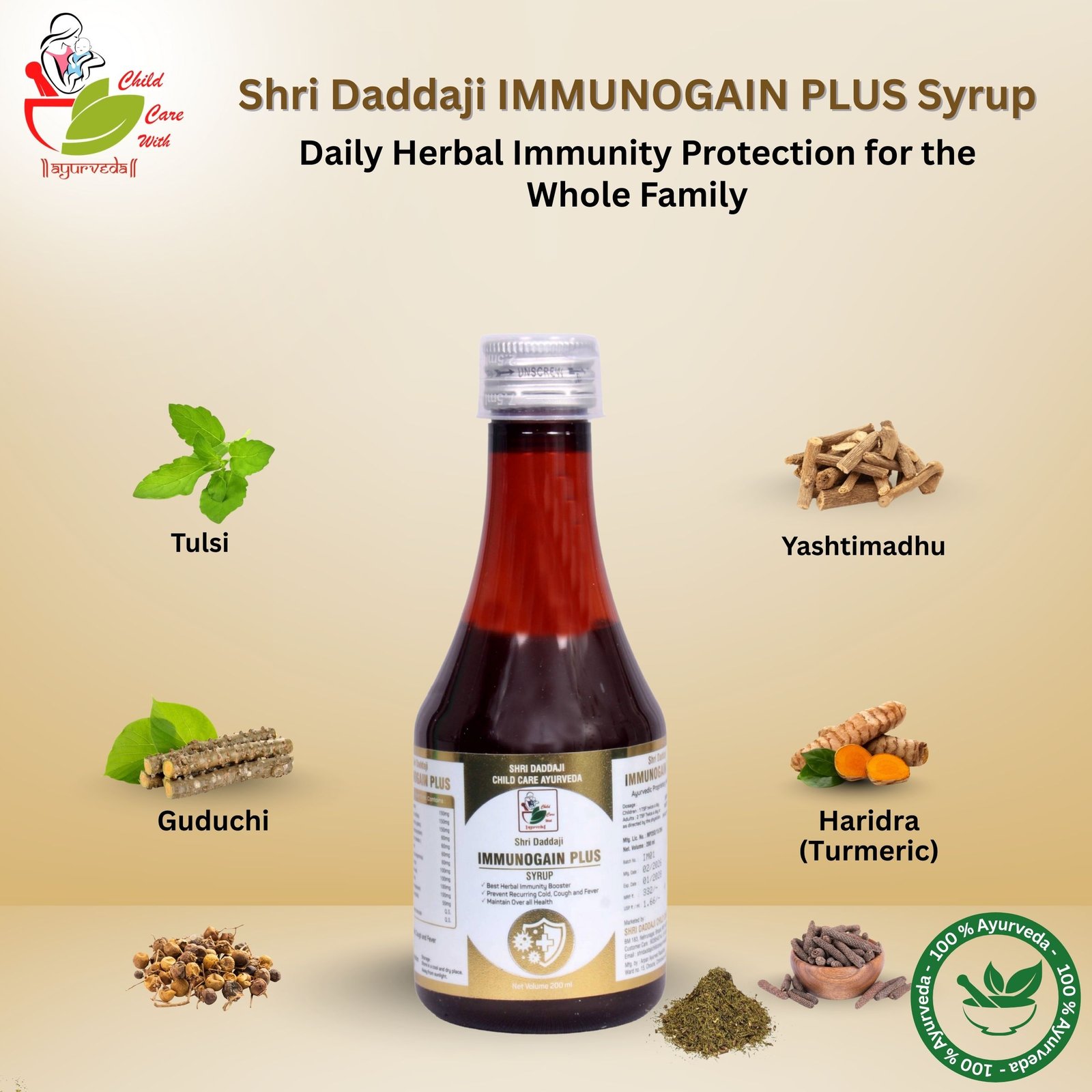 Shri Daddaji Immunogain Plus Syrup, Herbal Immunity Booster for Kids, Syrup Form, with Tulsi, Guduchi and Turmeric, 200 ml