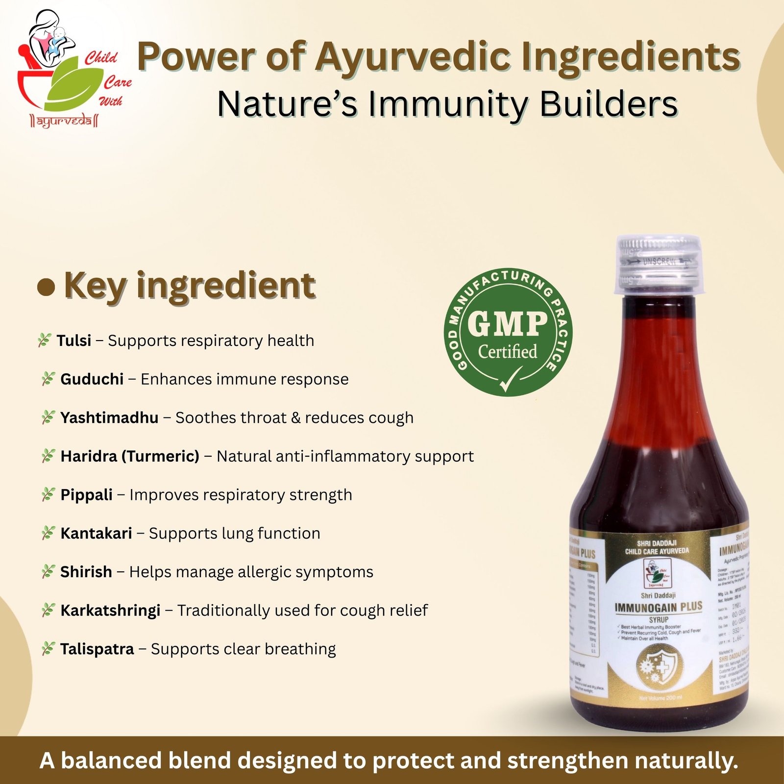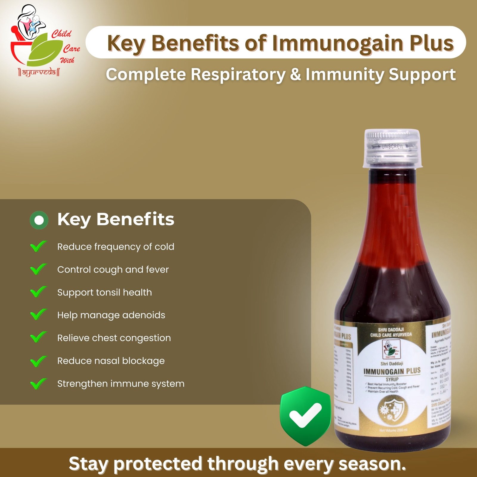 Strengthen your family’s natural defenses with Shri Daddaji Immunogain Plus Syrup. This herbal Ayurvedic formula is specifically crafted to enhance respiratory health and provide a shield against seasonal infections.