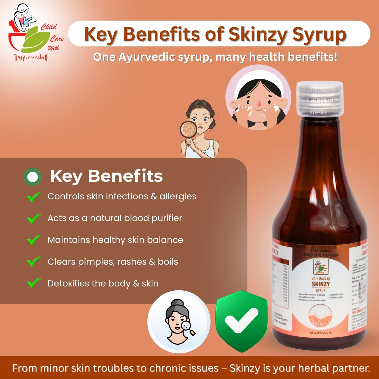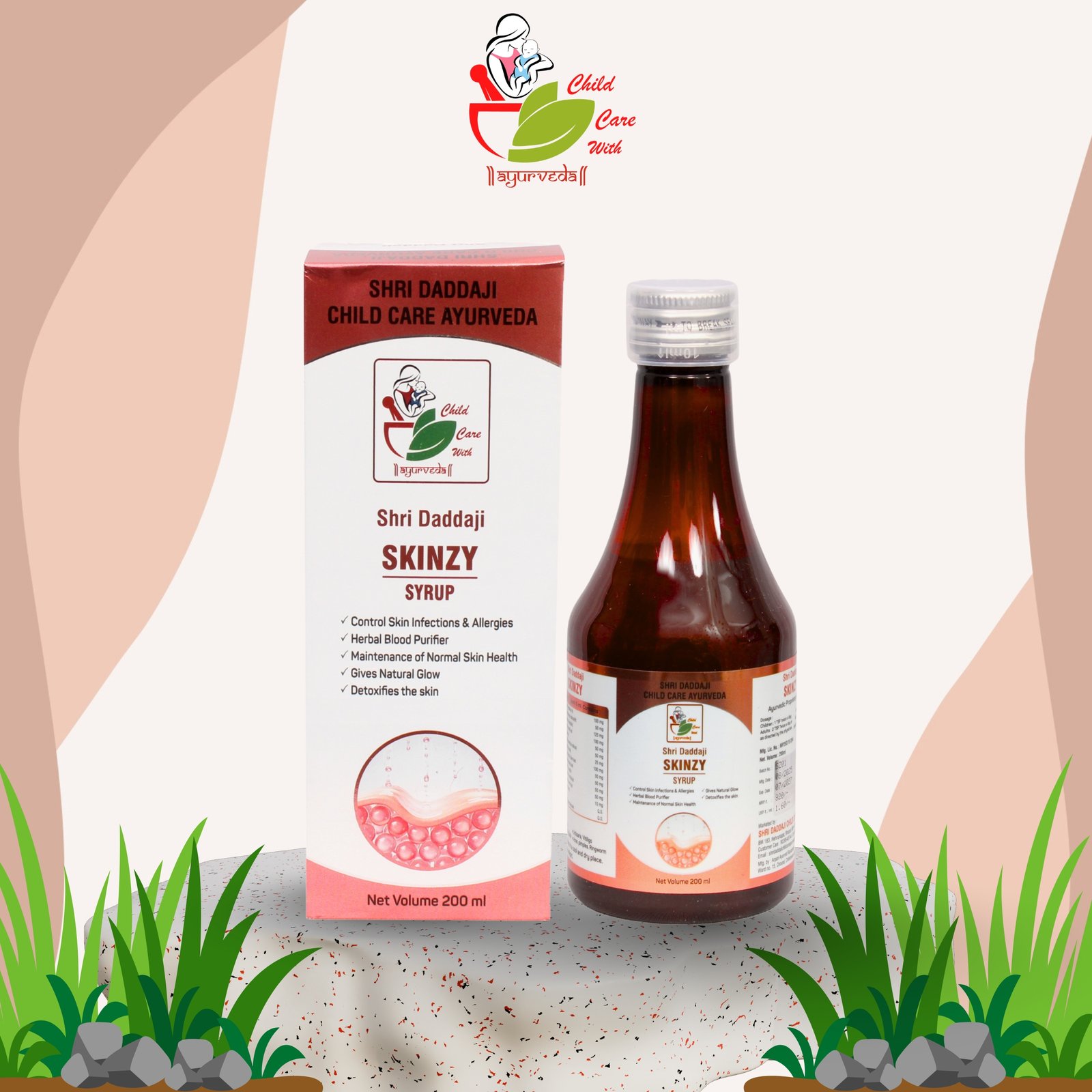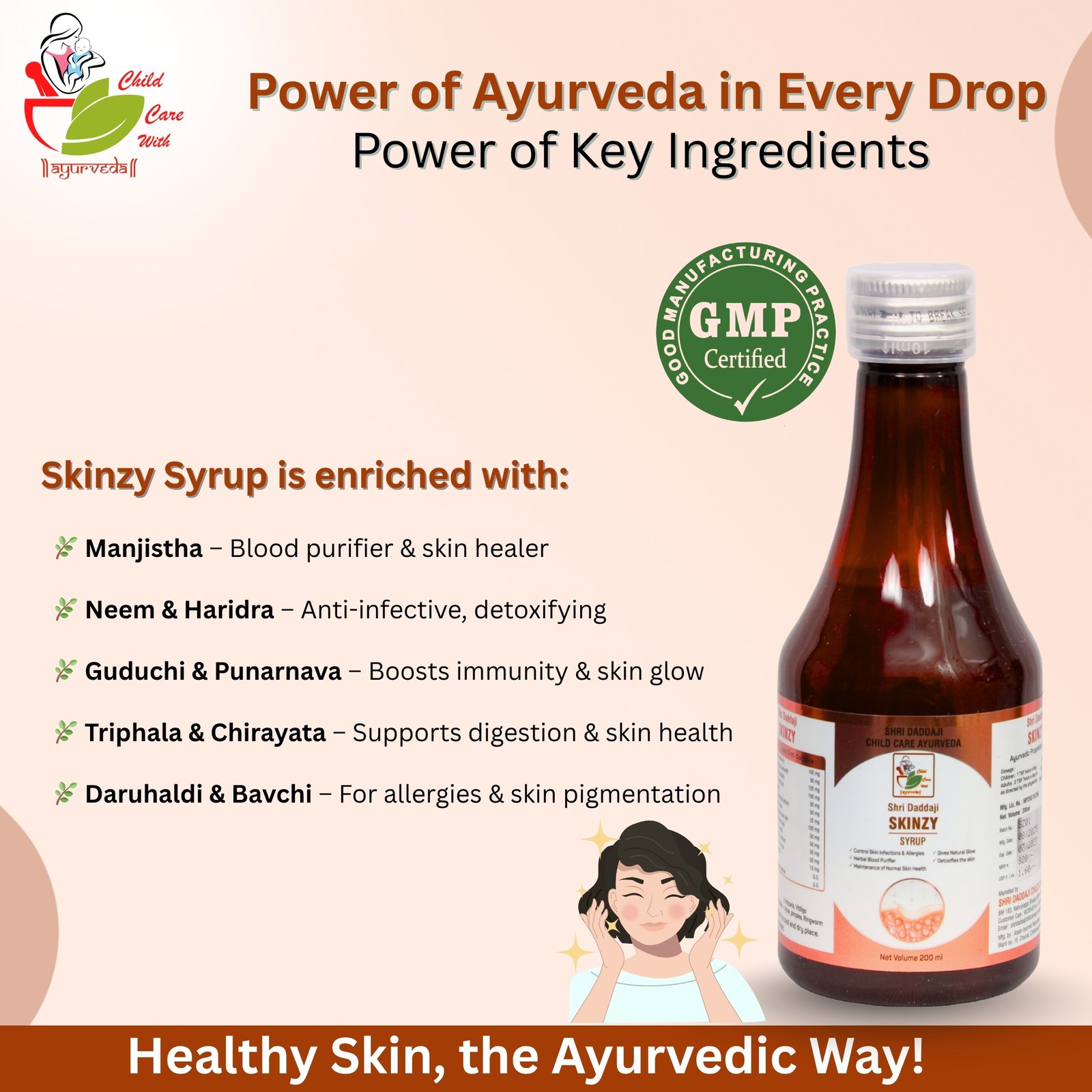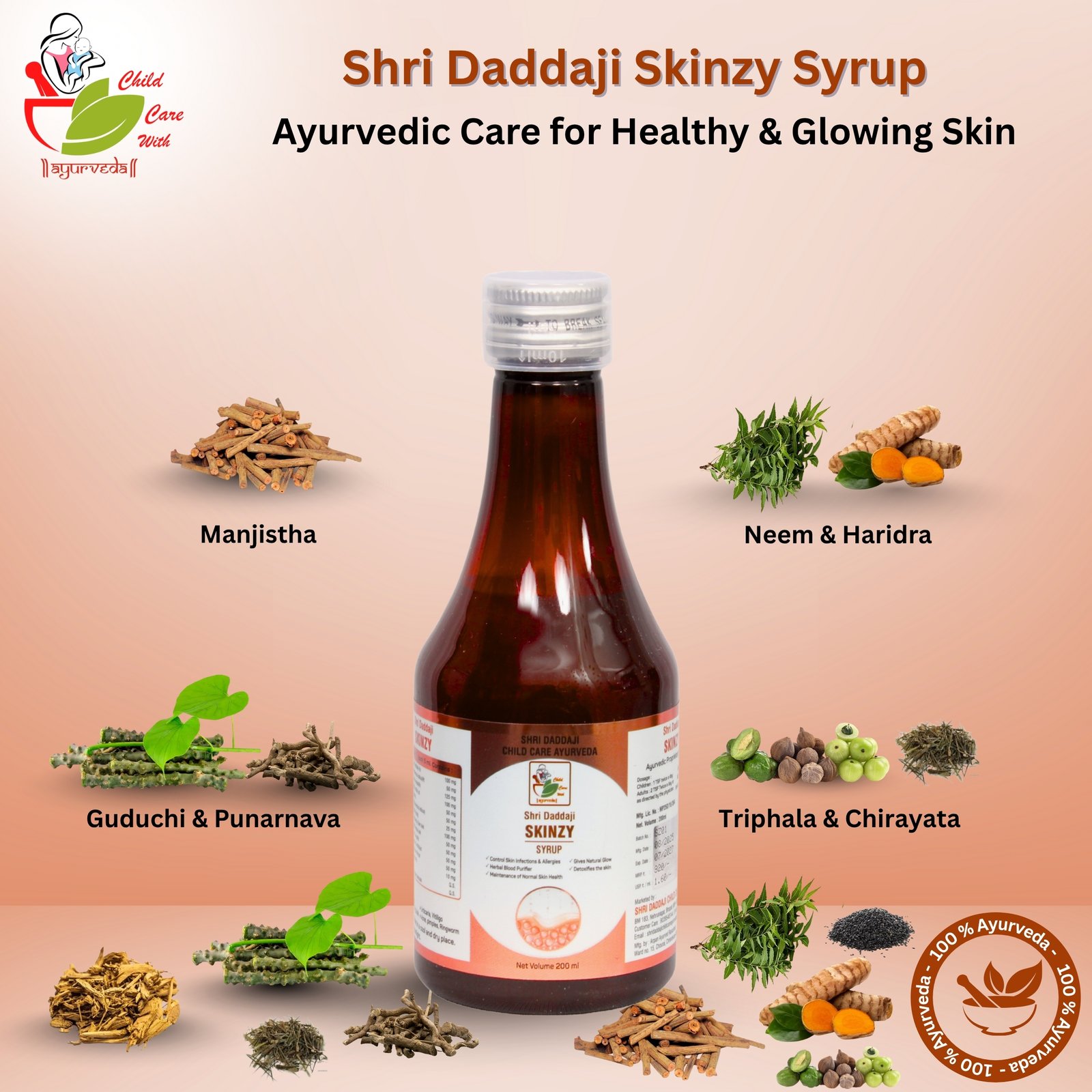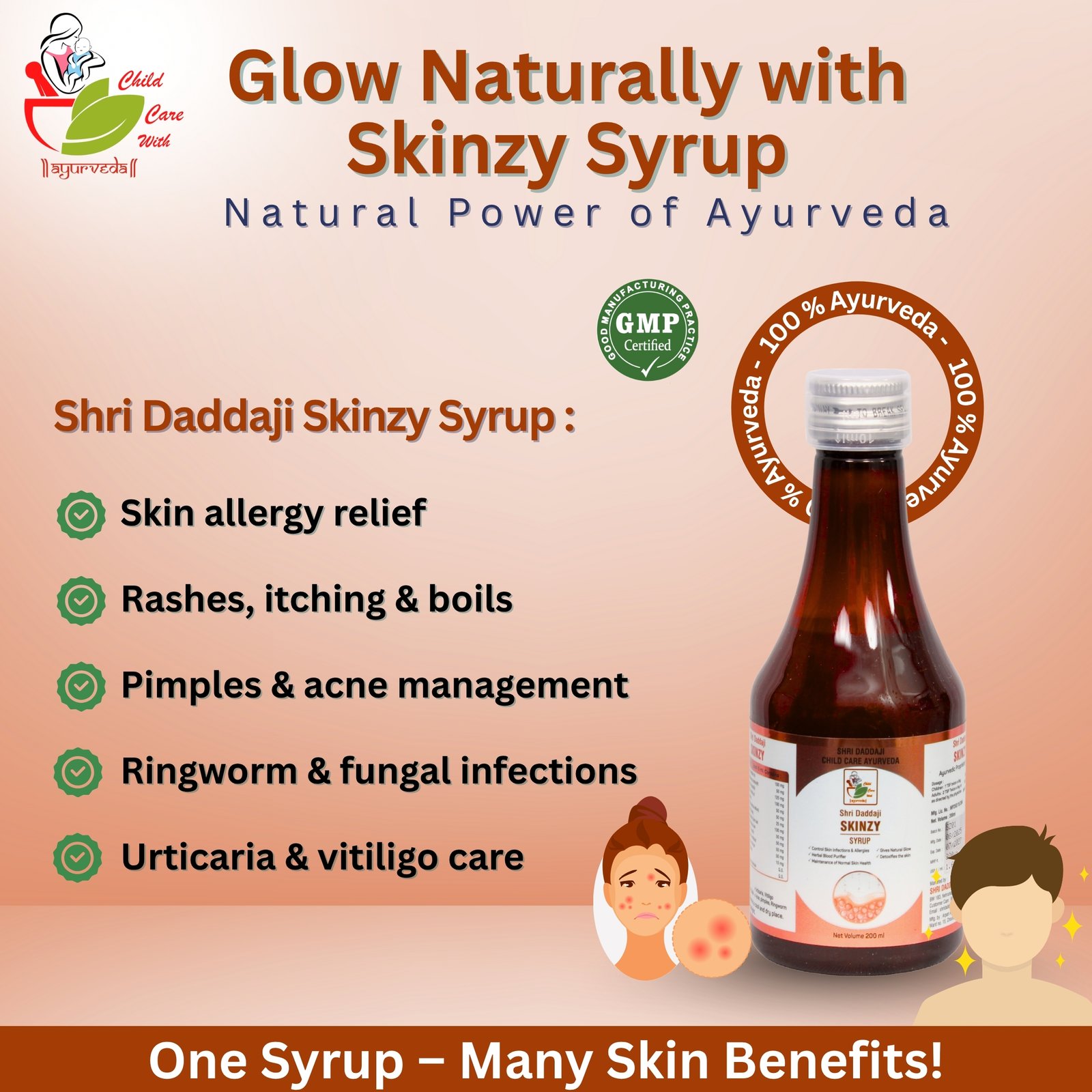Shri Daddaji Skinzy Ayurvedic Syrup for Healthy & Glowing Skin | Blood Purifier | Pimples, Acne, Allergies, Rashes, Fungal Infections Relief | 100% Herbal Formula – 200ml